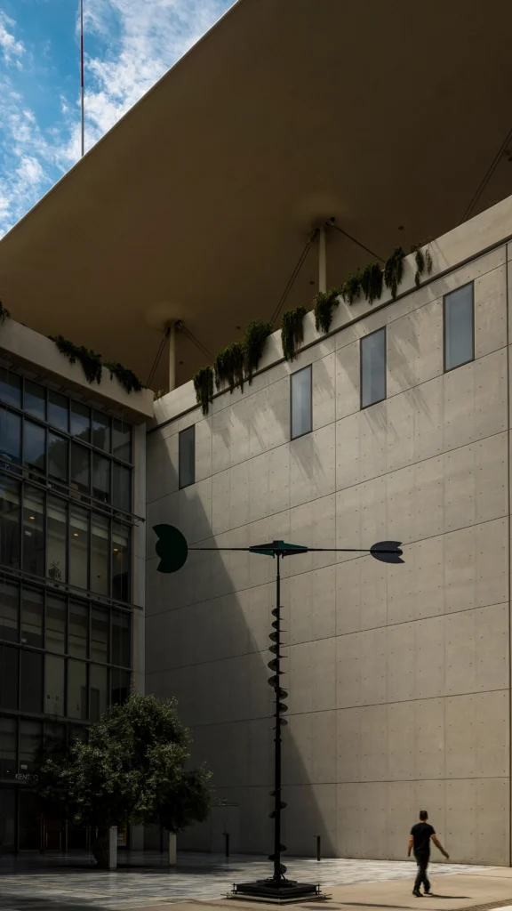 Four representative works by the iconic Greek sculptor—one emblematic Aeolian and three Magnetic Wall Sculptures—will be on view in the public space of the SNFCC until the end of October. Together and individually, these works highlight key aspects of Takis’ practice as a leading figure in Kinetic Sculpture, a pioneering artist known for his ingenuity and insight. Magnetism, among other forces, was a fundamental element in his creative process.