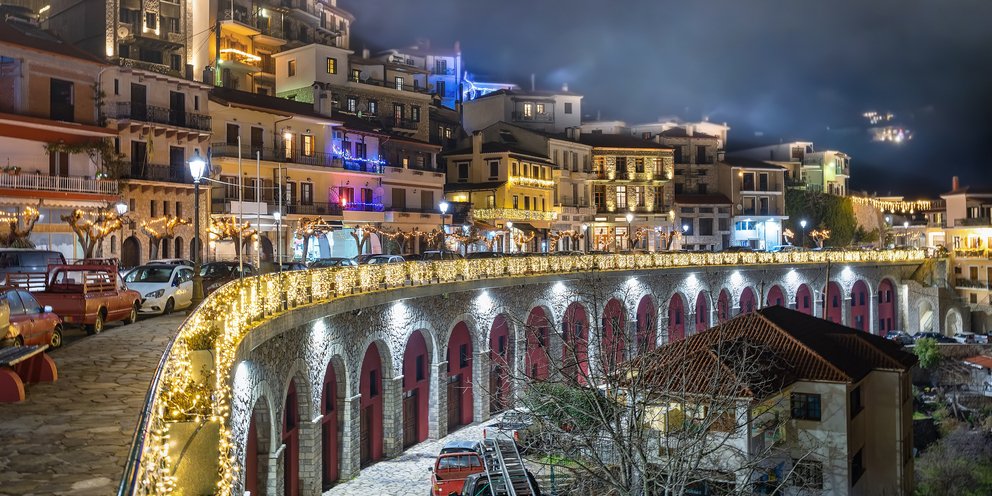 Nestled on the slopes of Mount Parnassus, Arachova is  probably the most popular Christmas destination in Greece, even  without an artificial Christmas village: it’s a Christmas village itself. Known as the “Winter Mykonos,” this picturesque village combines cozy alpine charm with vibrant nightlife. Stroll through snow-dusted streets, savor traditional dishes by the fire, and shop for handmade gifts. For adventurers, nearby ski slopes and scenic trails await. Whether you’re seeking relaxation or winter thrills, Arachova offers a magical holiday escape
