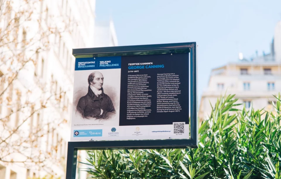 The “Walking with the Philhellenes” project took place recently in the context of the celebration of the 200th anniversary of the Greek Revolution. 62 signs for 29 Philhellenes were placed on streets of  the city bearing the names of the Philhellenic Movement as well a QRcode, which links to a web application, providing in Greek and English additional information about Philhellene and the Philhellenic Movement and also accompanying podcasts. Their portraits are displayed on them, as well as explanatory historical texts – in Greek and in English – with information about their personalities were compiled by a team of leading historians.
